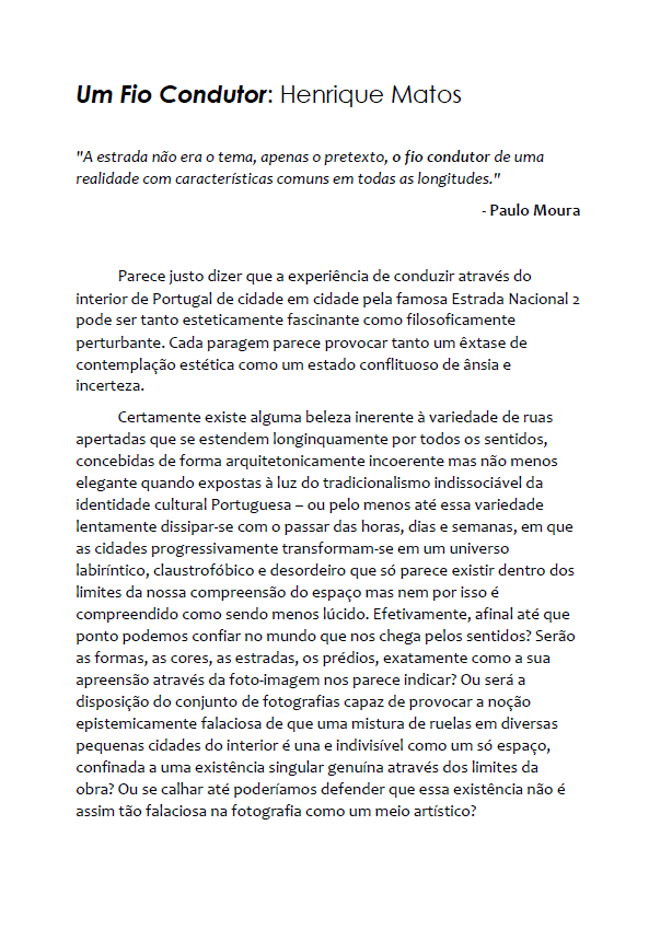Surgindo durante o processo criativo das viagens decorrentes do Núcleo de Fotografia da Associação de Estudantes da Faculdade de Letras da Universidade de Lisboa (NF – AE FLUL), “Um Fio Condutor” foi o resultado de um conjunto de excursões sobre a extensão da Estrada Nacional 2, uma das mais antigas e longas vias de Portugal. Partindo do centro para o sul, grande parte do percurso foi realizado pelo Alentejo através de passeios entre pequenas cidades, cada uma interessante o suficiente para gerar um levantamento fotográfico prolongado.